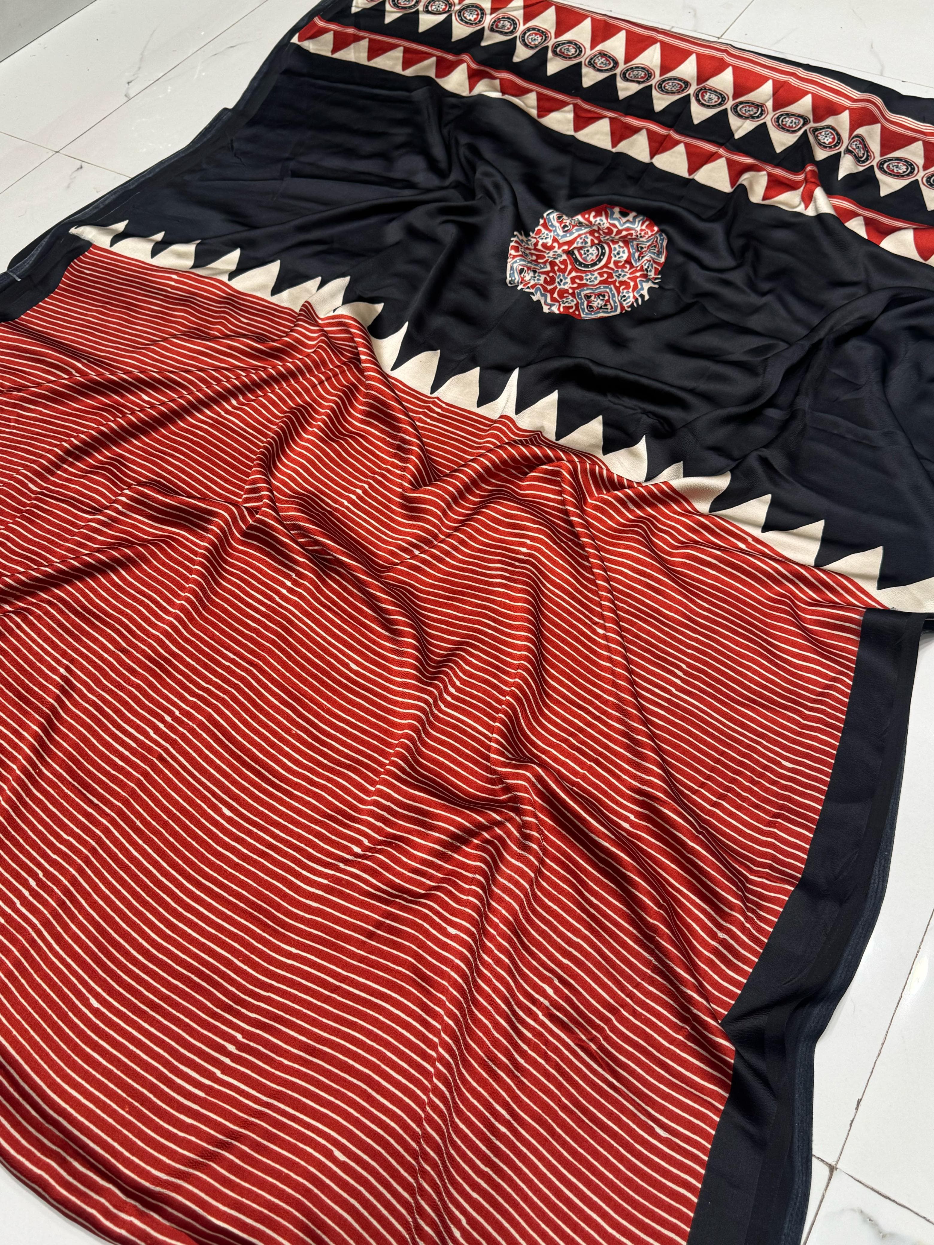 Crape Flower Print Saree with Gajji Digital Printed beautiful Blouse for daily and wedding Saree Crape Silk Colour Border with printed beautiful Blouse