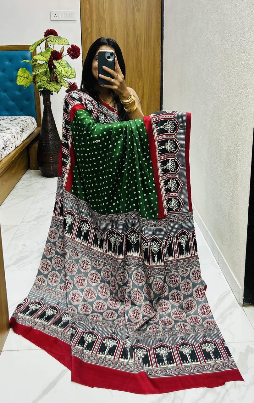 Bollywood Crape Print Saree with Gajji Digital Printed beautiful Blouse for daily and wedding Saree Crape Silk Colour Border with printed beautiful Blouse