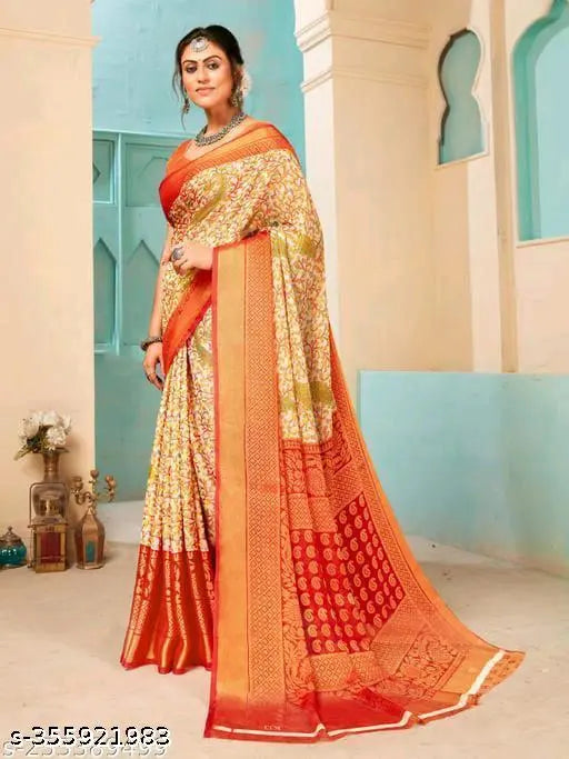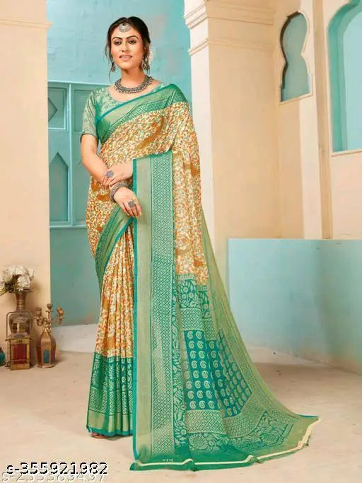 Explore the collection of beautifully designed sarees from Satrani Sarees On Meesho. Saree Fabric : Brasso & Blouse Fabric : Brasso :: Saree Color : Green, Multi & Blouse Color : Green, Orange :: Saree Work :Self Woven (Floral) & Blouse Work : Self Woven