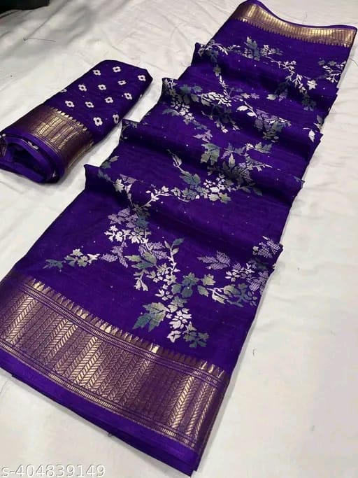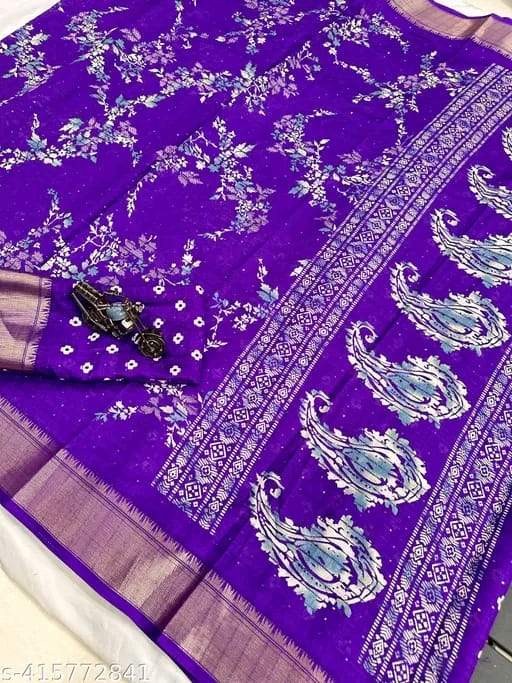 Super pure dola silk Sparkle zari FLOWER printed fancy Collections of Sarees with Contrast jacquard Border , Pallu and Blouse. Premium Quality Assured. Very Soft Fabric and Beautiful Border and Pallu with Contrast Blouse.dola silk is most Demanding in S