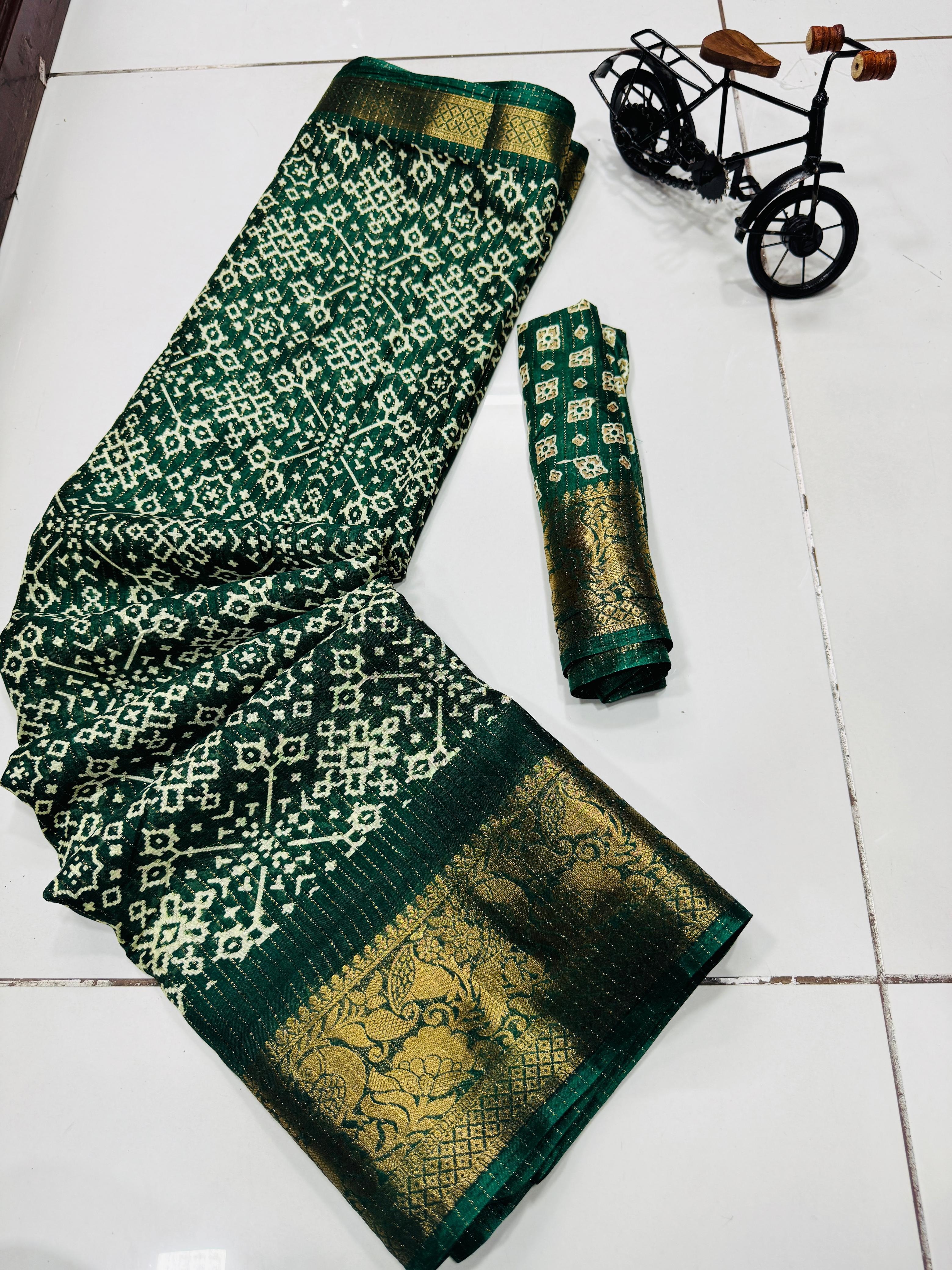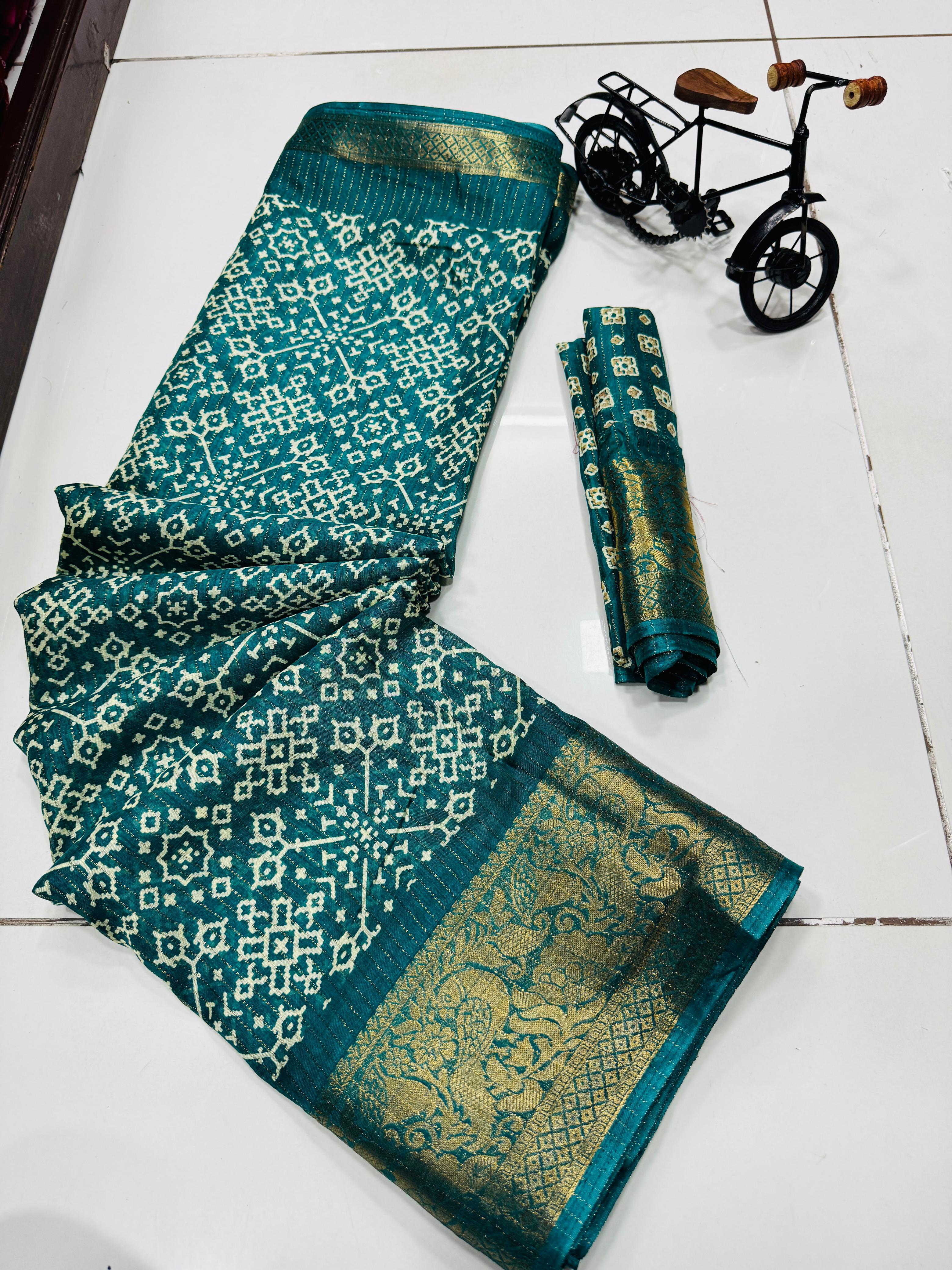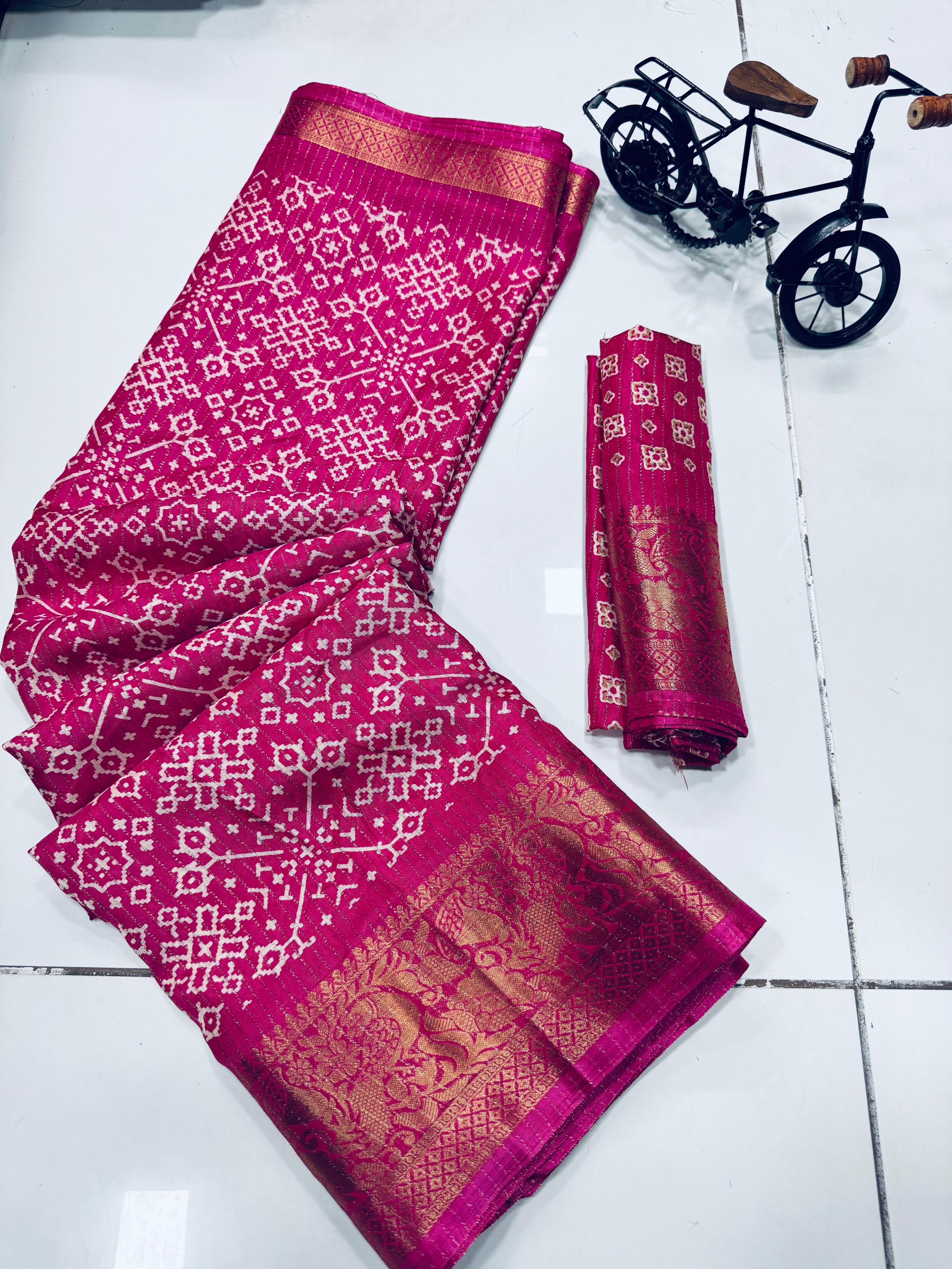 Super pure dola silk Sparkle zari printed fancy Collections of Sarees with Contrast jacquard Border , Pallu and Blouse. Premium Quality Assured. Very Soft Fabric and Beautiful Border and Pallu with Contrast Blouse.dola silk is most Demanding in S