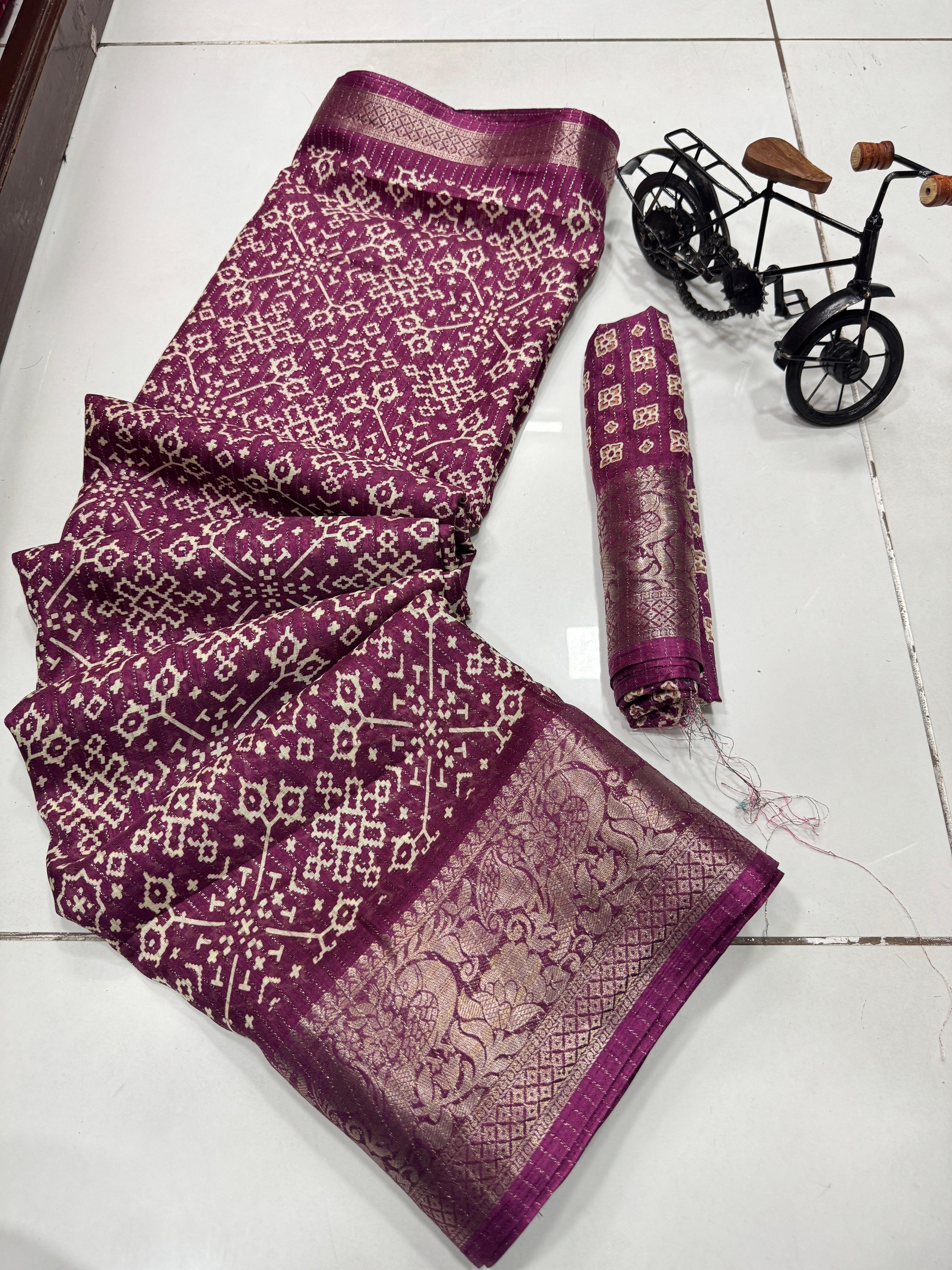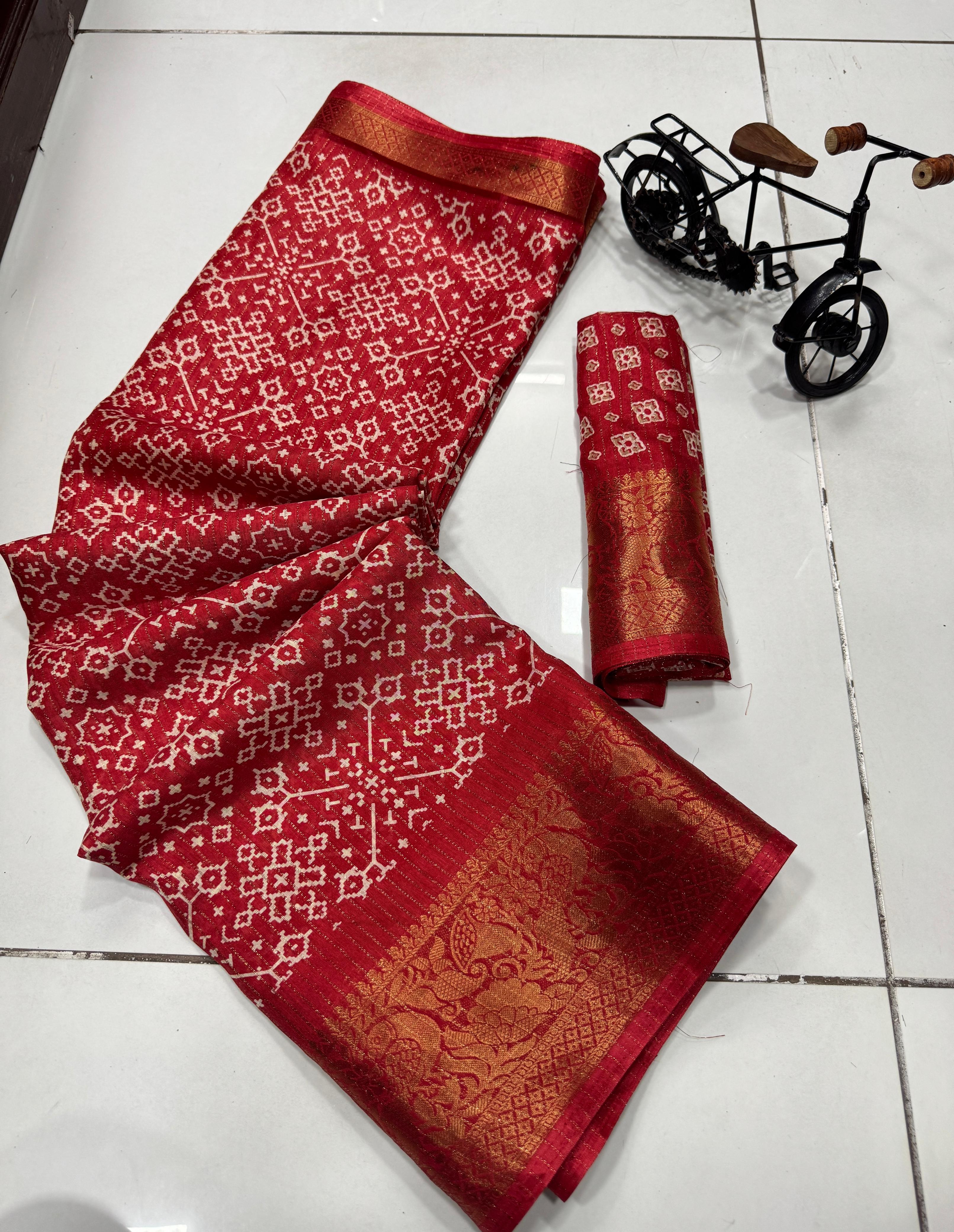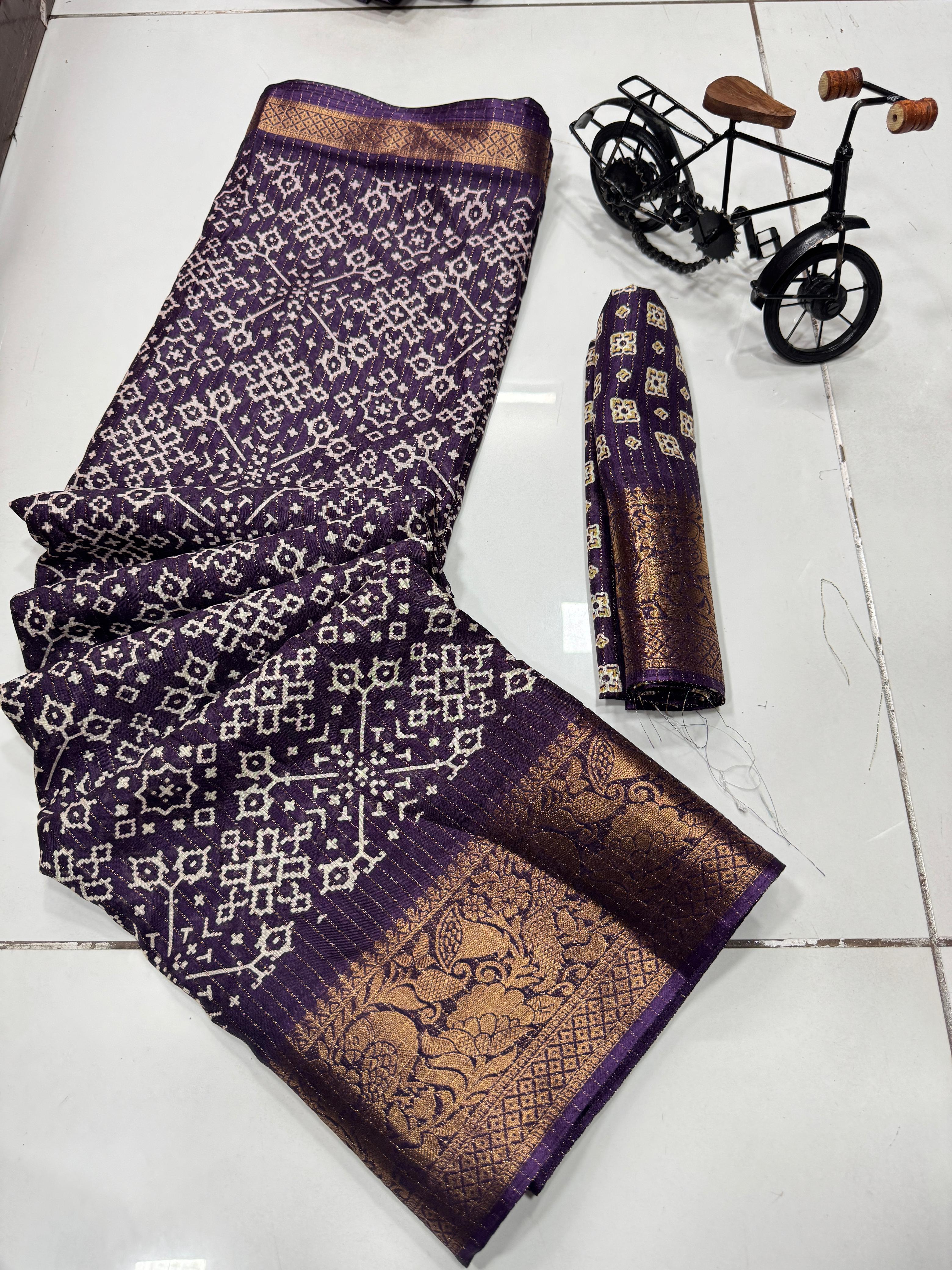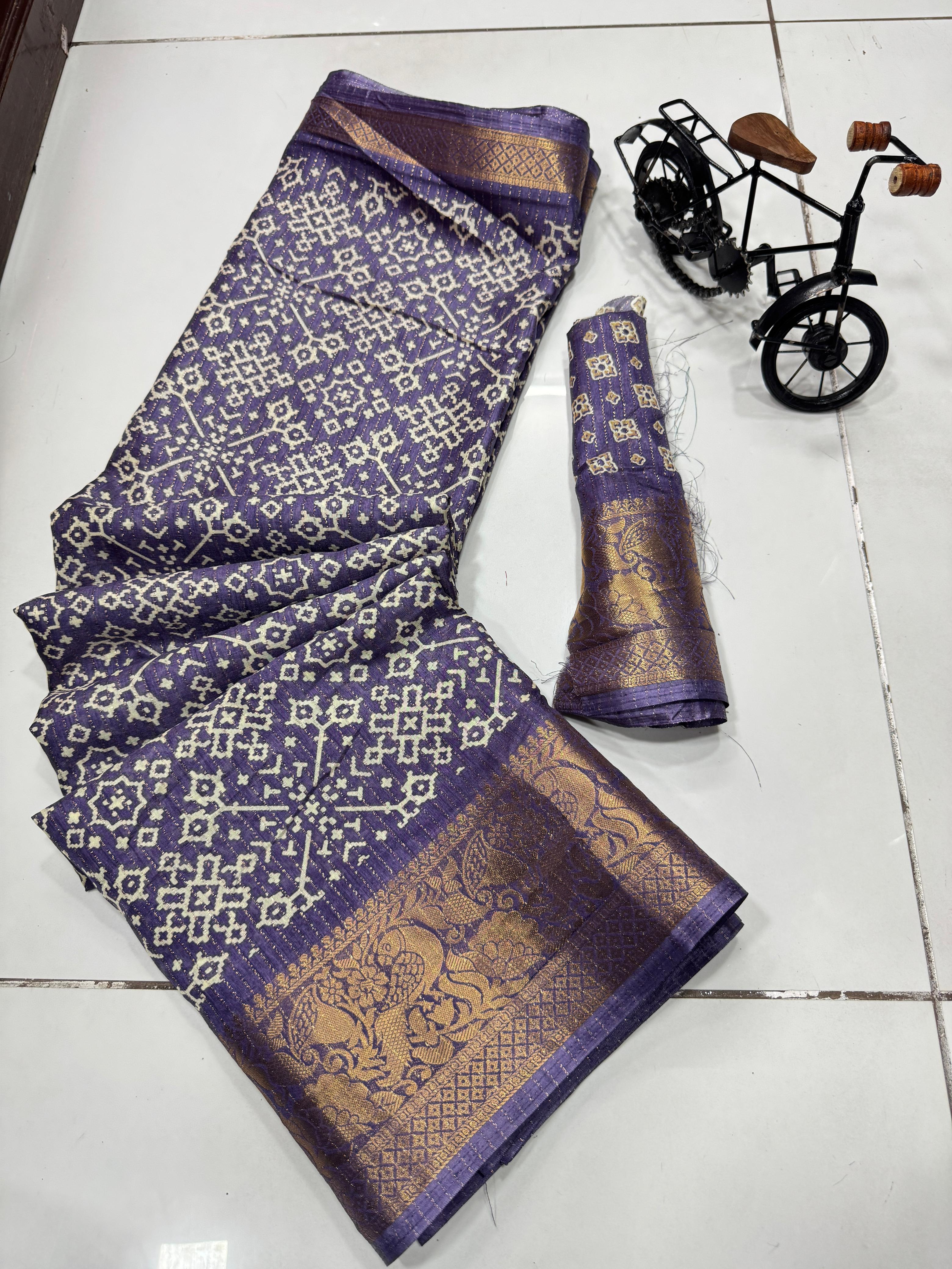 Super pure dola silk Sparkle zari printed fancy Collections of Sarees with Contrast jacquard Border , Pallu and Blouse. Premium Quality Assured. Very Soft Fabric and Beautiful Border and Pallu with Contrast Blouse.dola silk is most Demanding in S