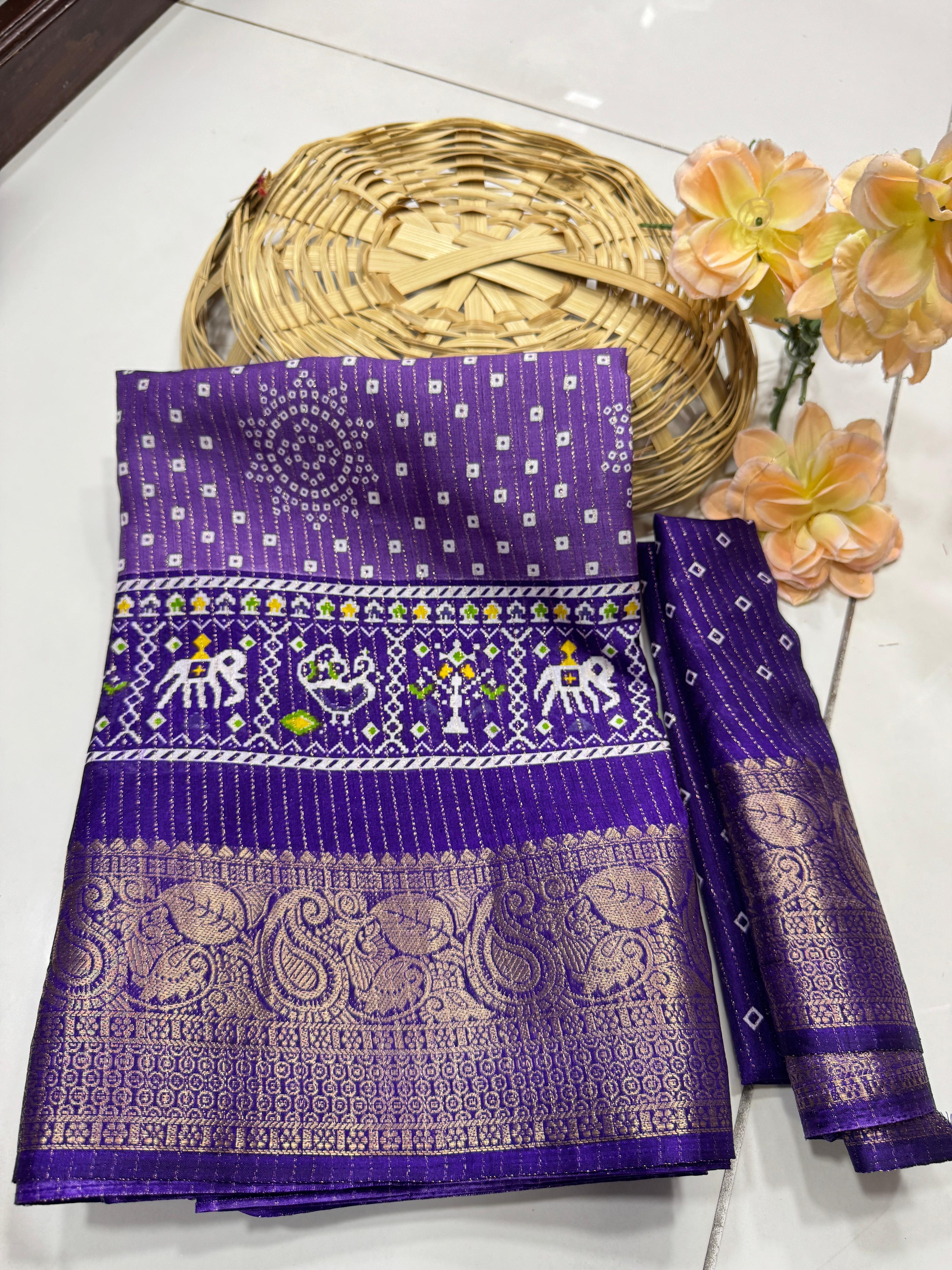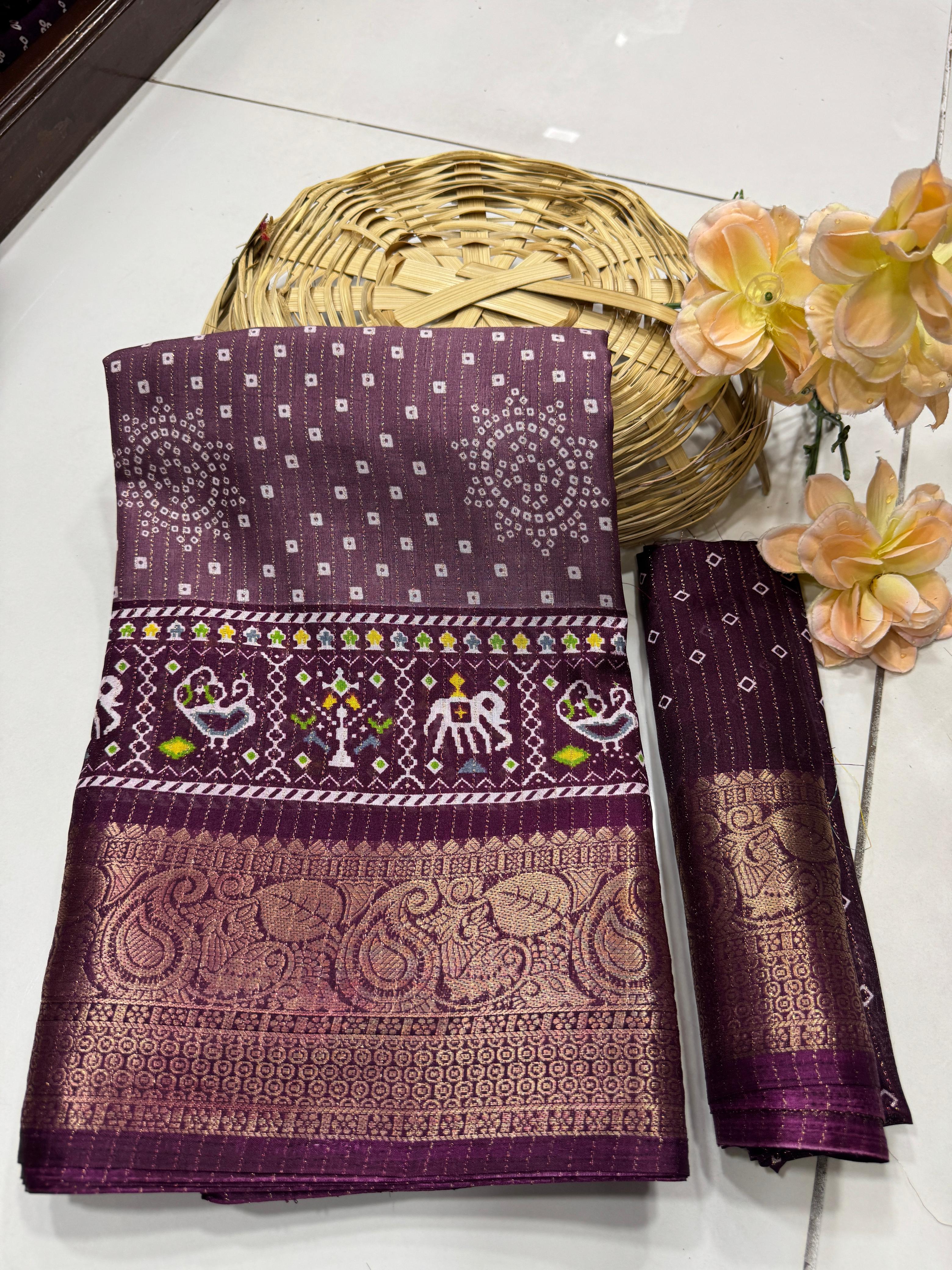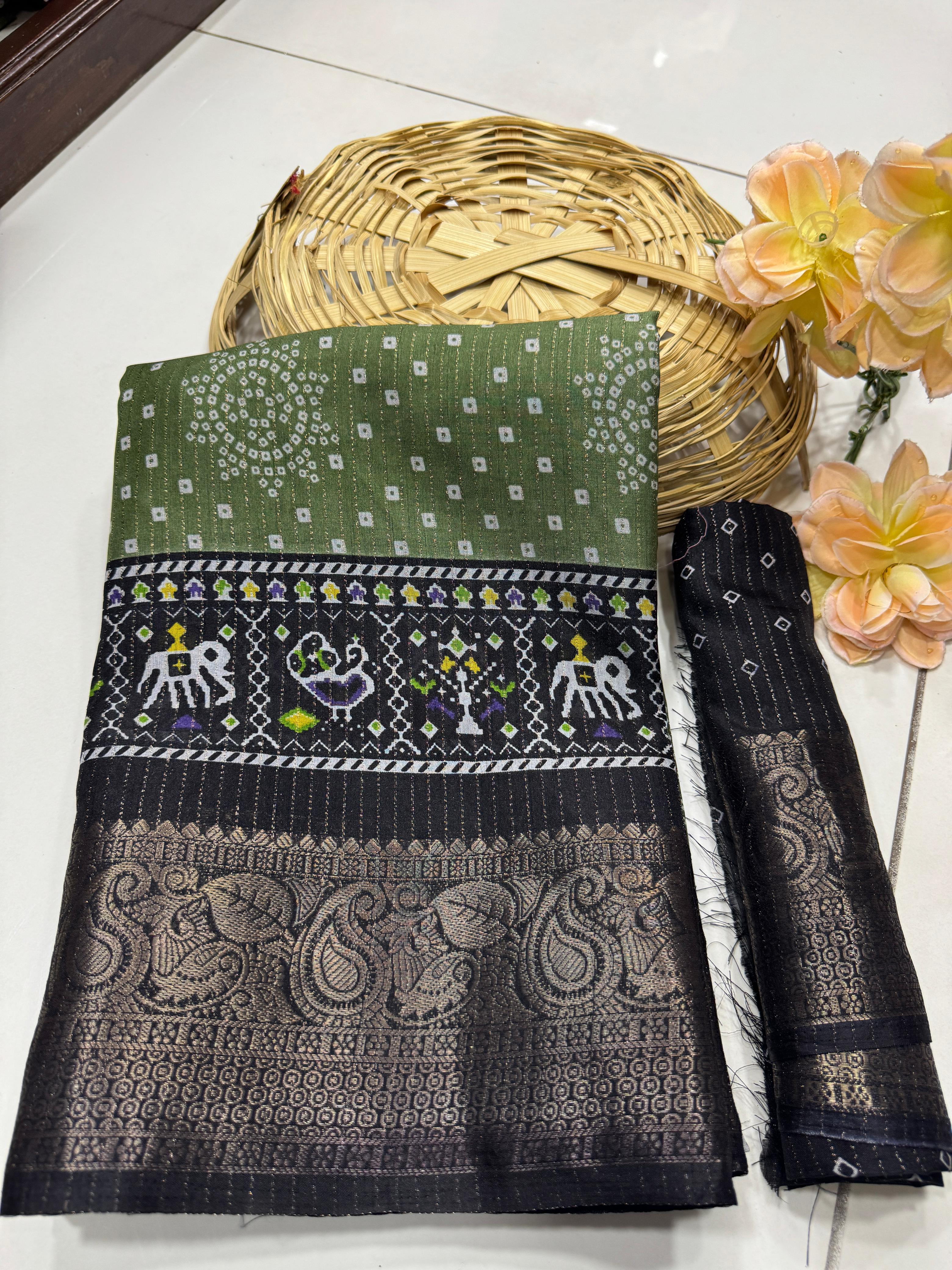 Super pure dola silk Sparkle zari printed fancy Collections of Sarees with Contrast jacquard Border , Pallu and Blouse. Premium Quality Assured. Very Soft Fabric and Beautiful Border and Pallu with Contrast Blouse.dola silk is most Demanding in S