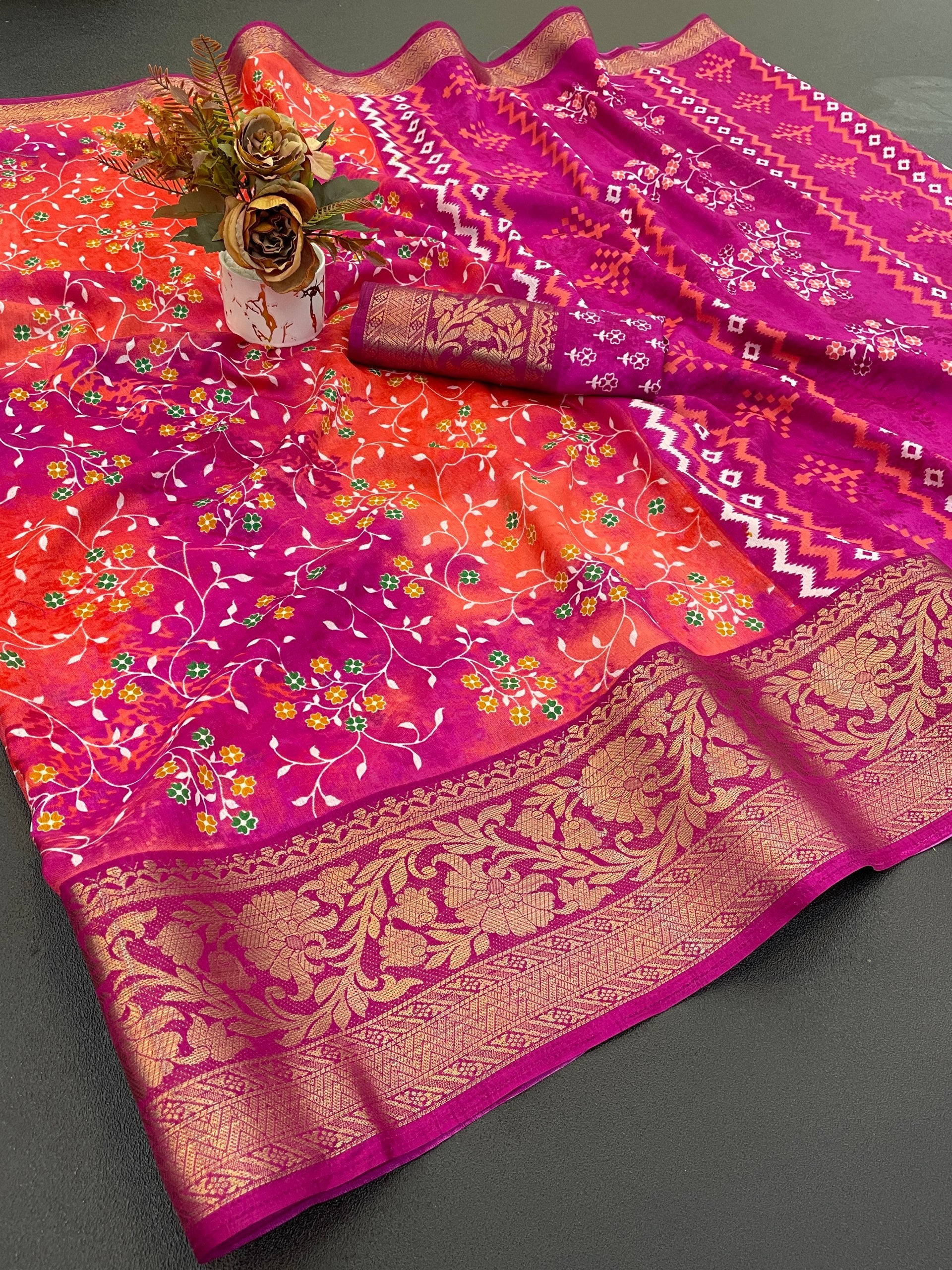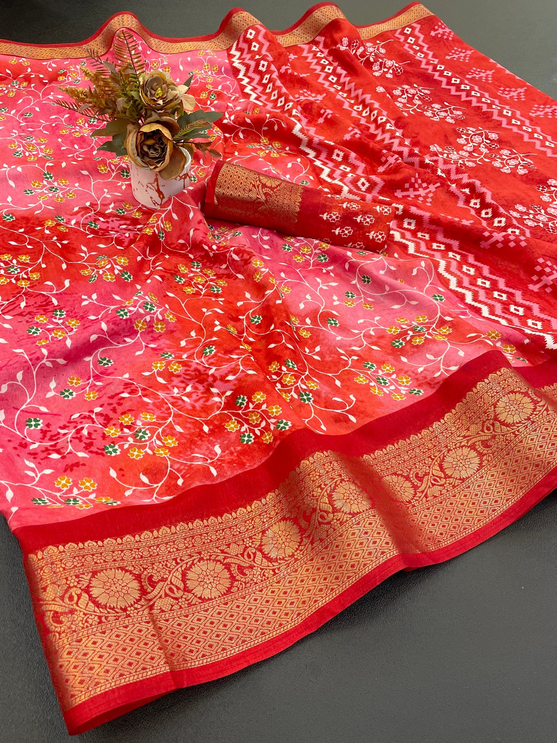 Dola Jequard Border kalamkari Print saree with Digital Printed beautiful Blouse for daily and wedding saree Dola Jequard Colour Border Batik White Colour saree with printed beautiful Blouse