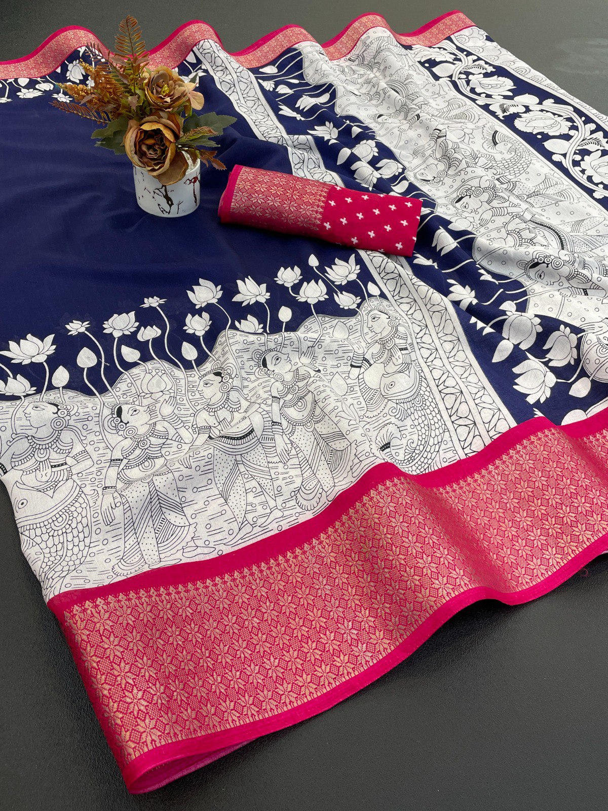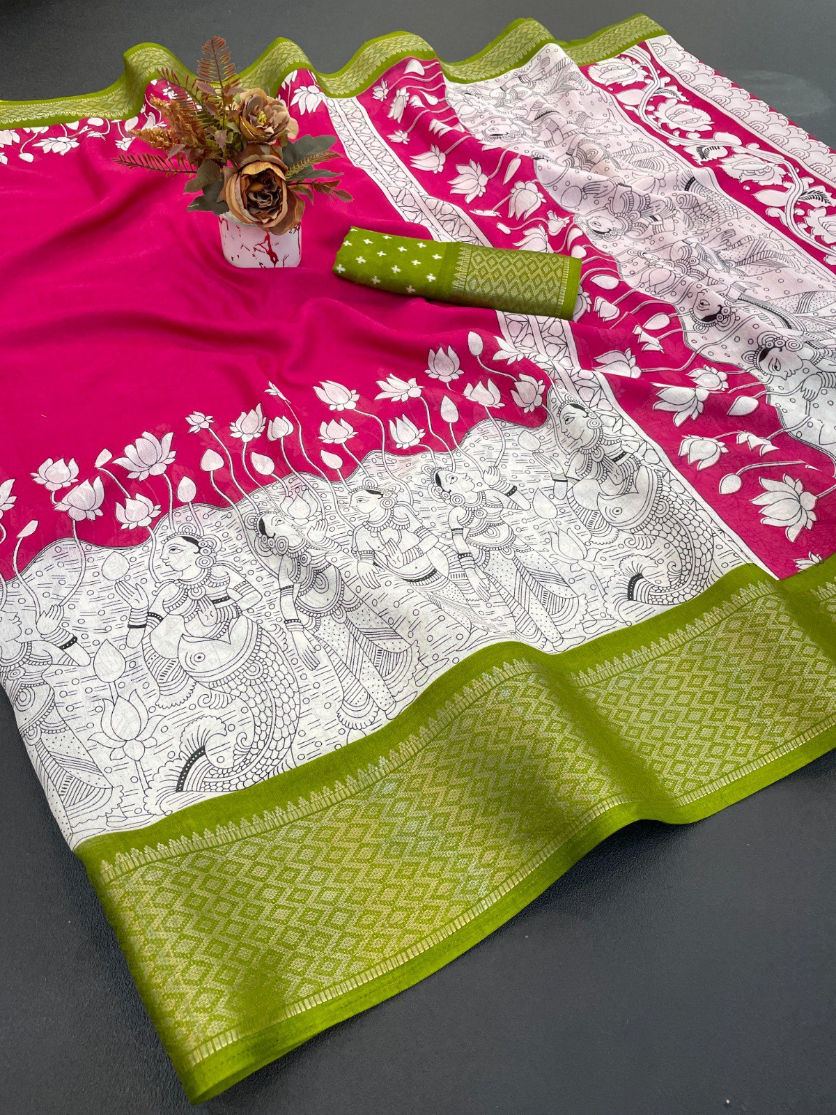 Dola Jequard Border kalamkari Print saree with Digital Printed beautiful Blouse for daily and wedding saree Dola Jequard Colour Border Batik White Colour saree with printed beautiful Blouse