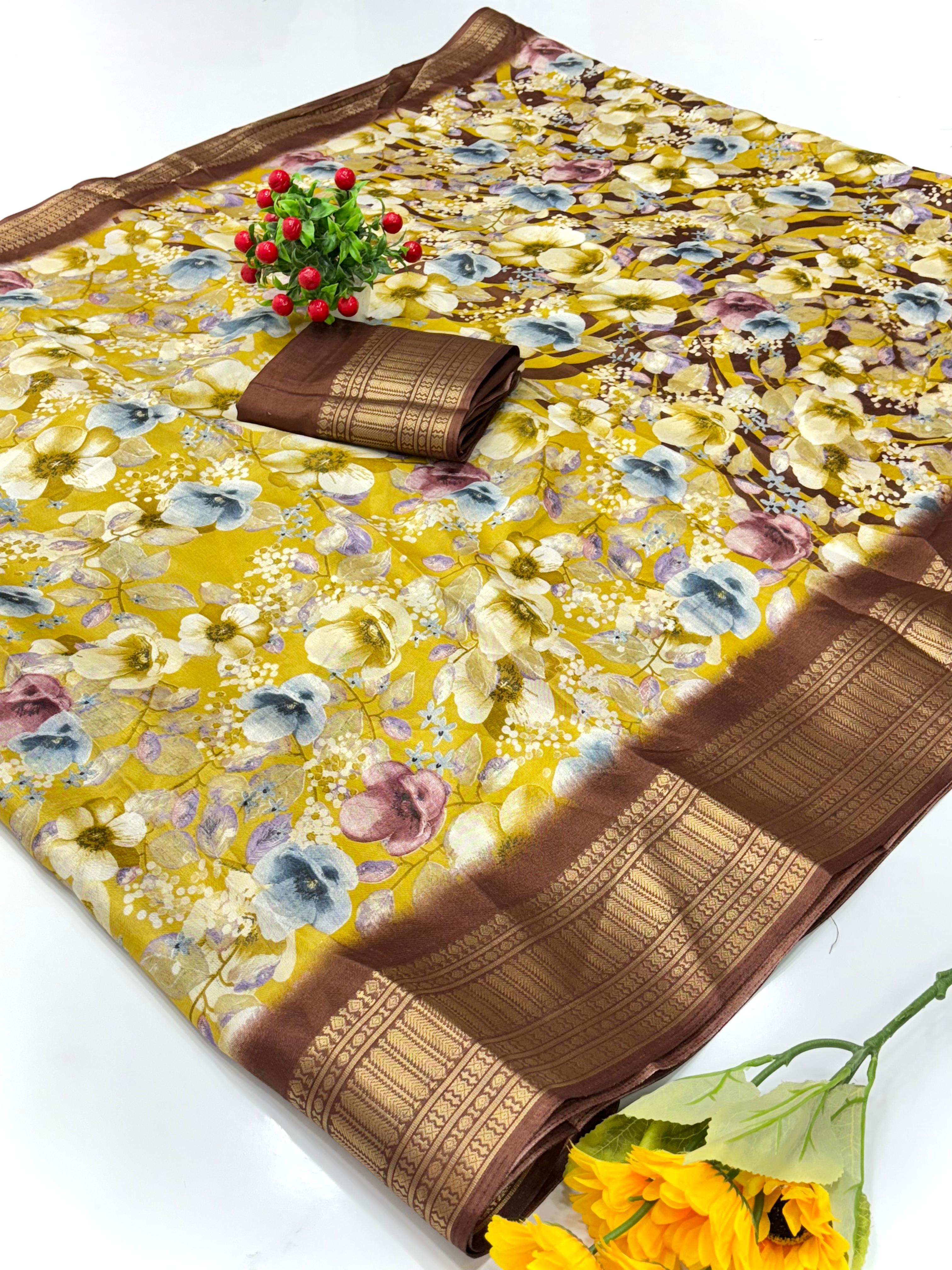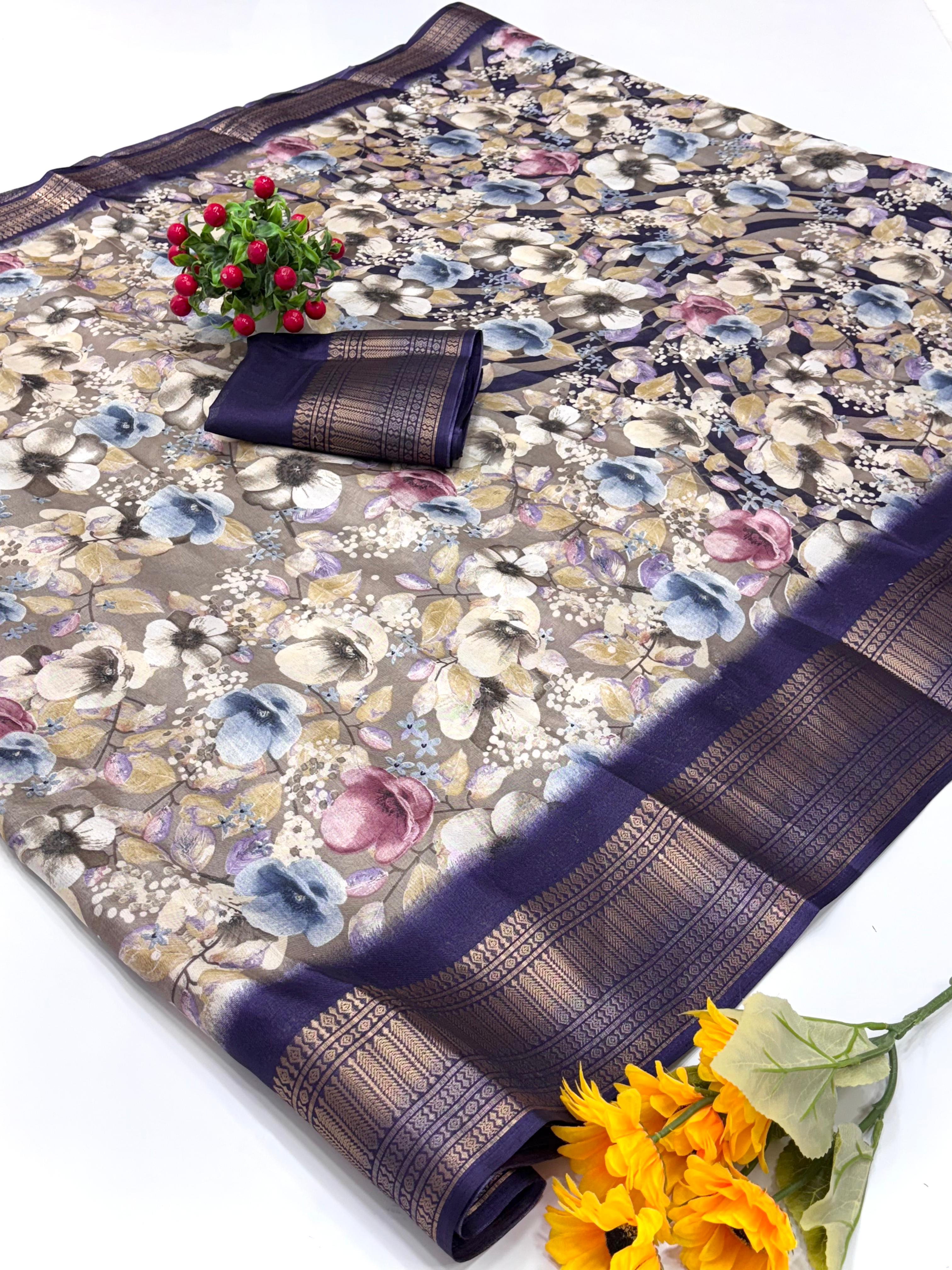 Dola Jequard Border Digital Flower Print saree with Digital Printed beautiful Blouse for daily and wedding saree Dola Sequence Jequard Colour Border Batik White Colour saree with printed beautiful Blouse