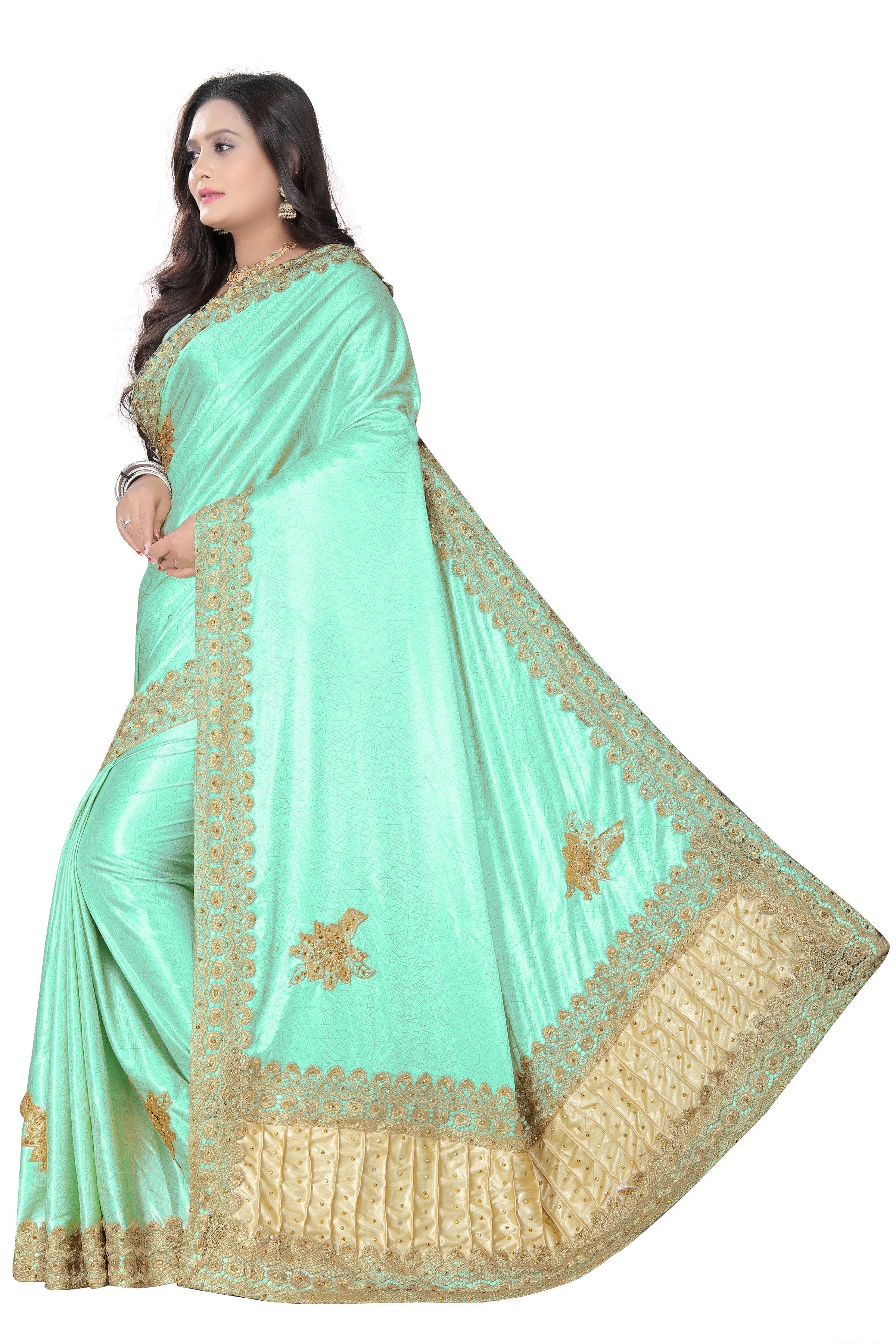 Saree Fabric : Lycra Blend(Super Lining) || Blouse Fabric: Dupion Silk || Work type : Embroidered Lace Border(Lace & Pastel) || Type : Stylish Designer Saree. Saree comes with unstitched blouse piece,which is attached with end of the saree only. Buyer have to cut blouse part from the saree. Product image is modelling done by professional with best contrast and background so we may feel slight colour or style variation. Jewellery shown in the image is for only photography purpose jewelry is not sold with saree.