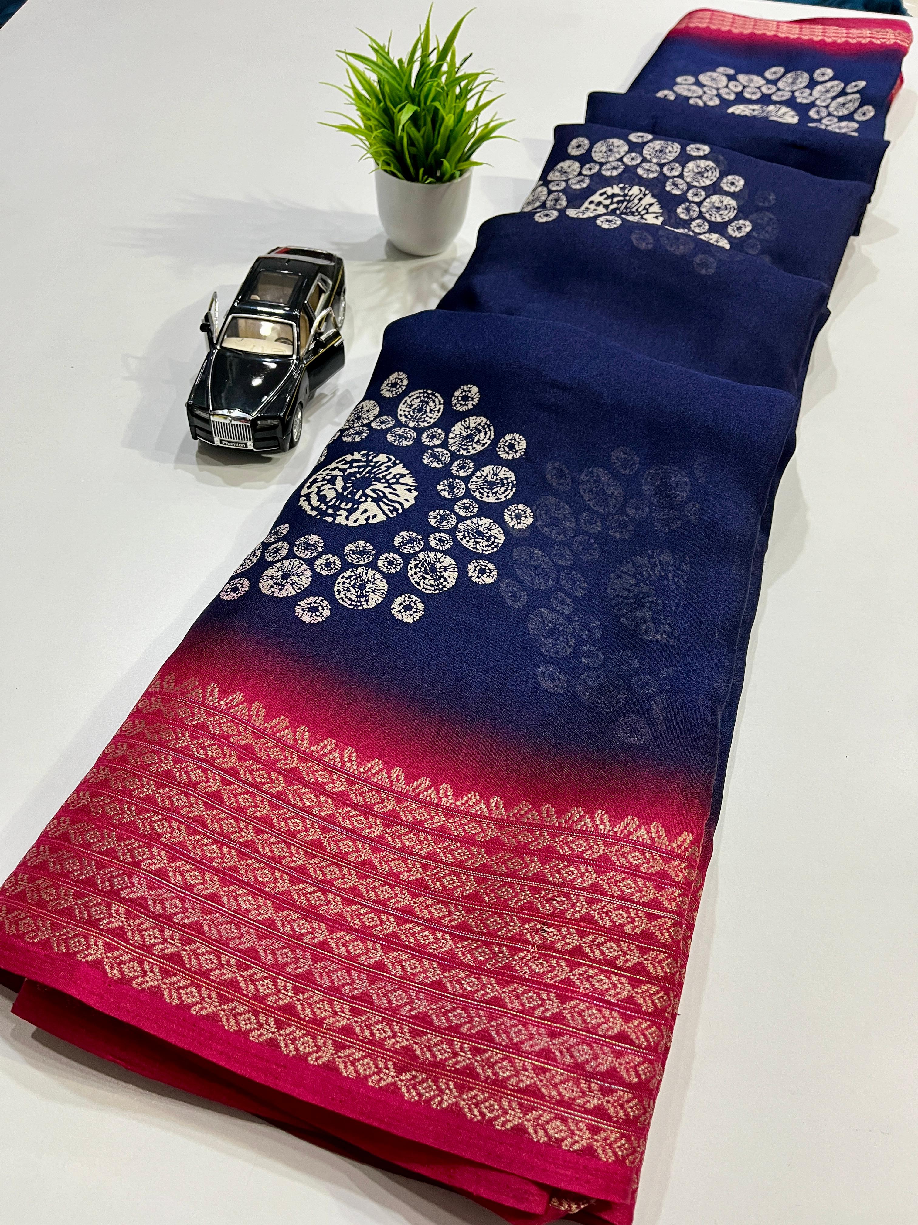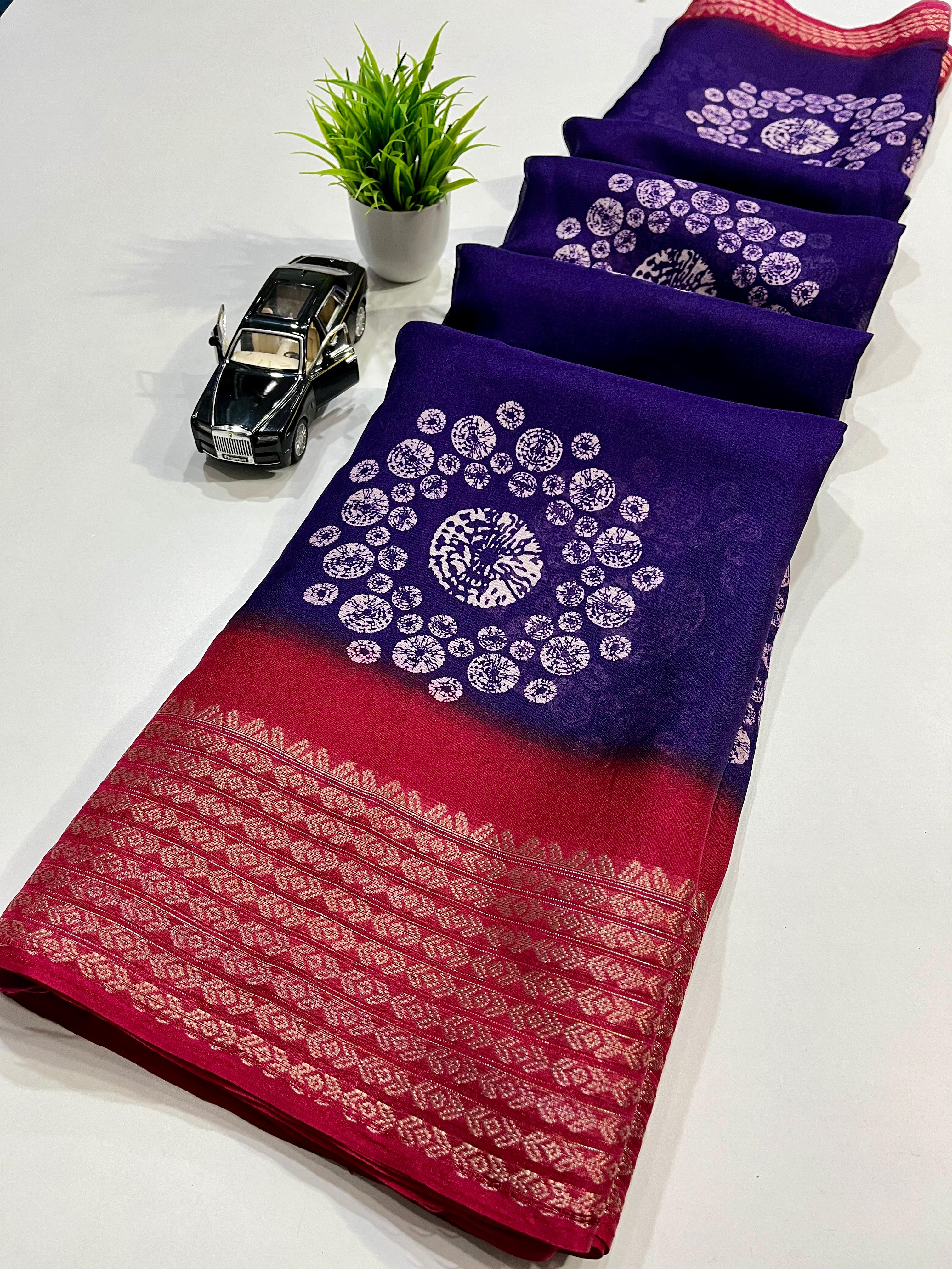 Saree Fabric : Marshmallow Silk || Blouse Fabric : Marshmallow Silk || Saree Work : Bandhni Print|| Blouse Work : Flower Print