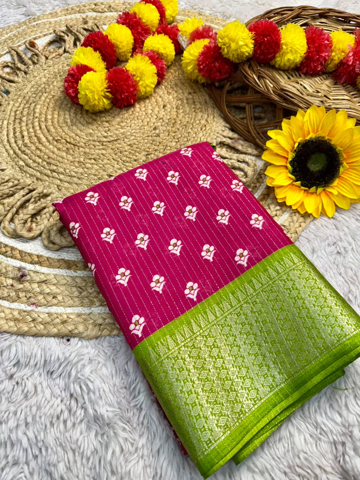 Super pure dola silk Sparkle zari FLOWER printed fancy Collections of Sarees with Contrast jacquard Border , Pallu and Blouse. Premium Quality Assured. Very Soft Fabric and Beautiful Border and Pallu with Contrast Blouse.dola silk is most Demanding in S