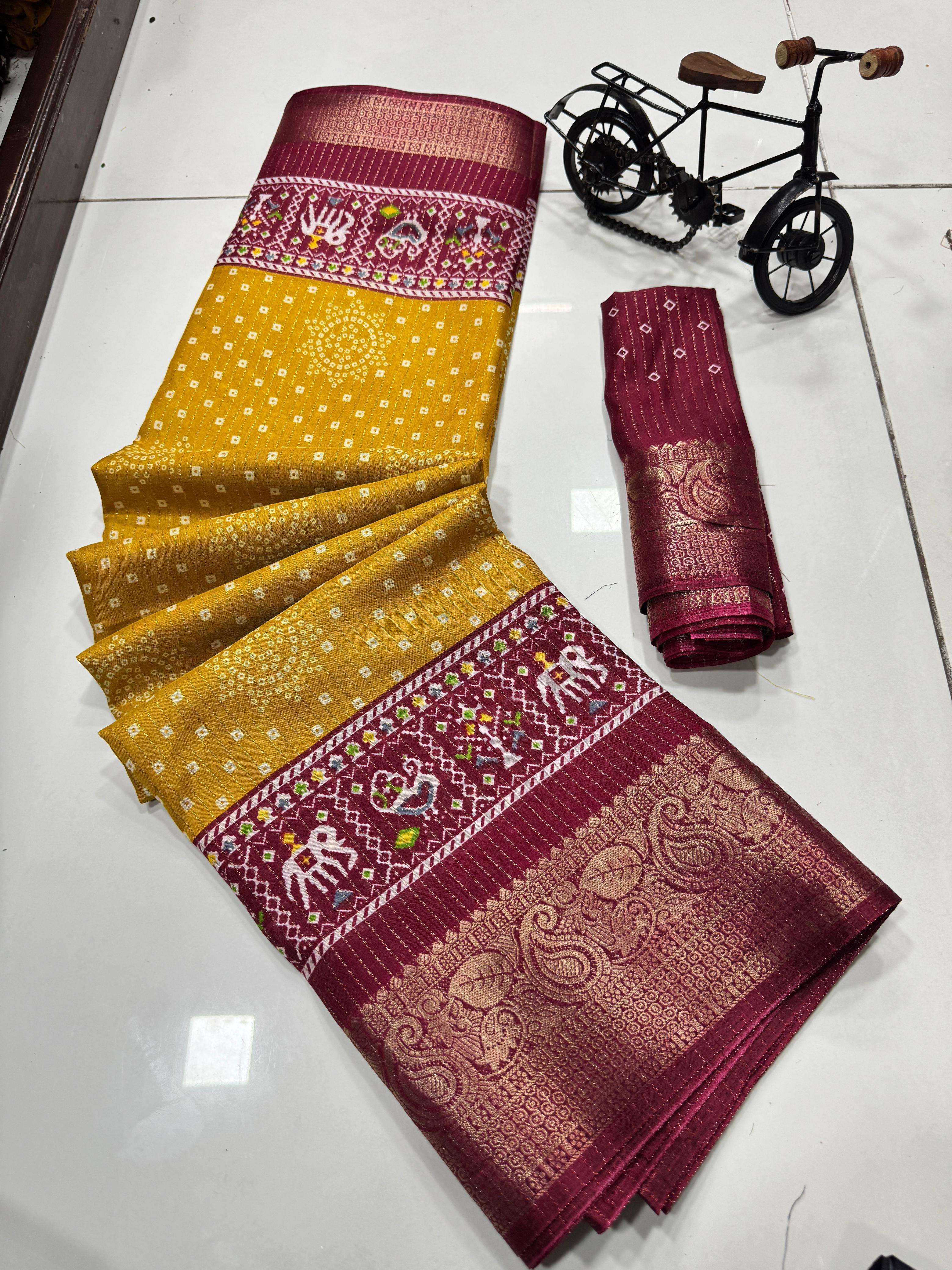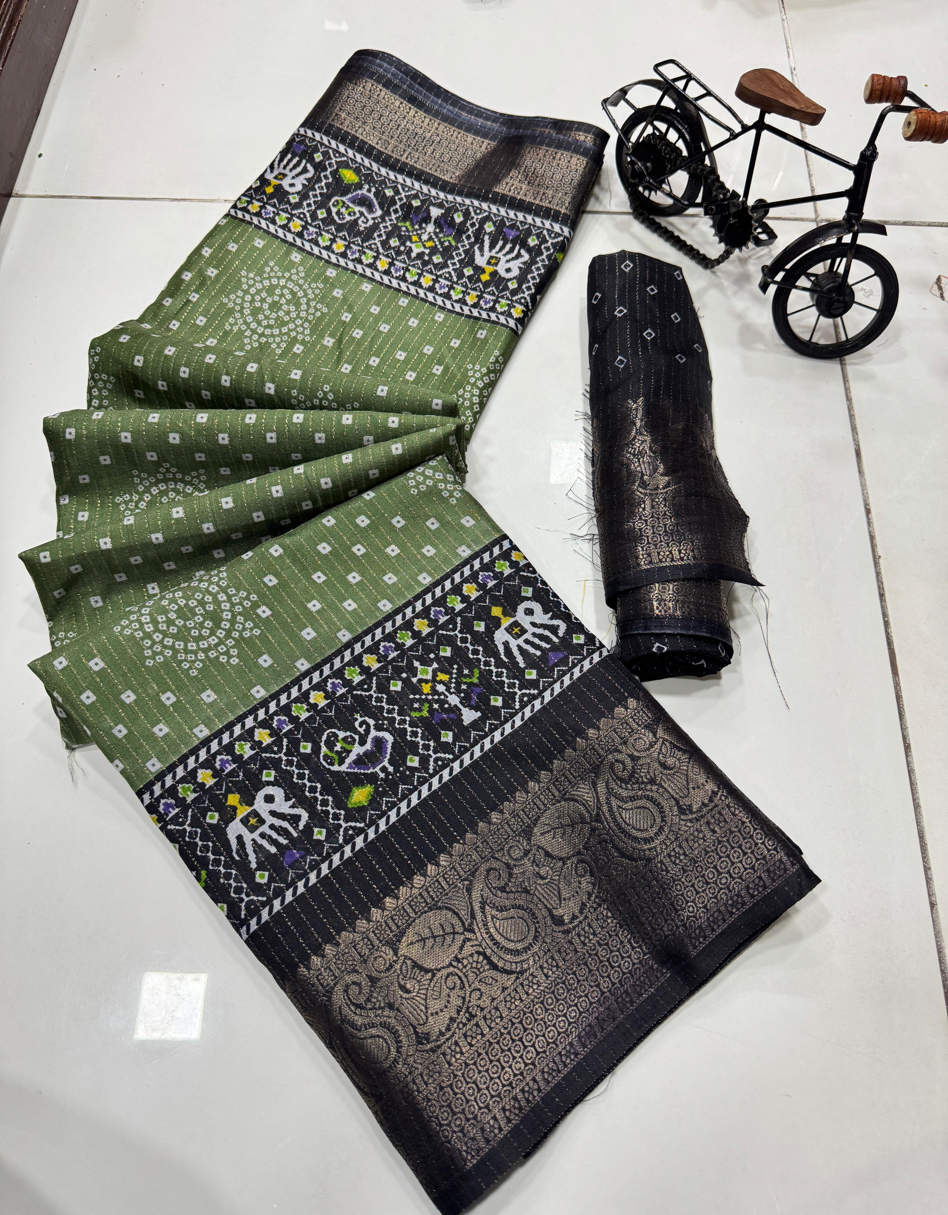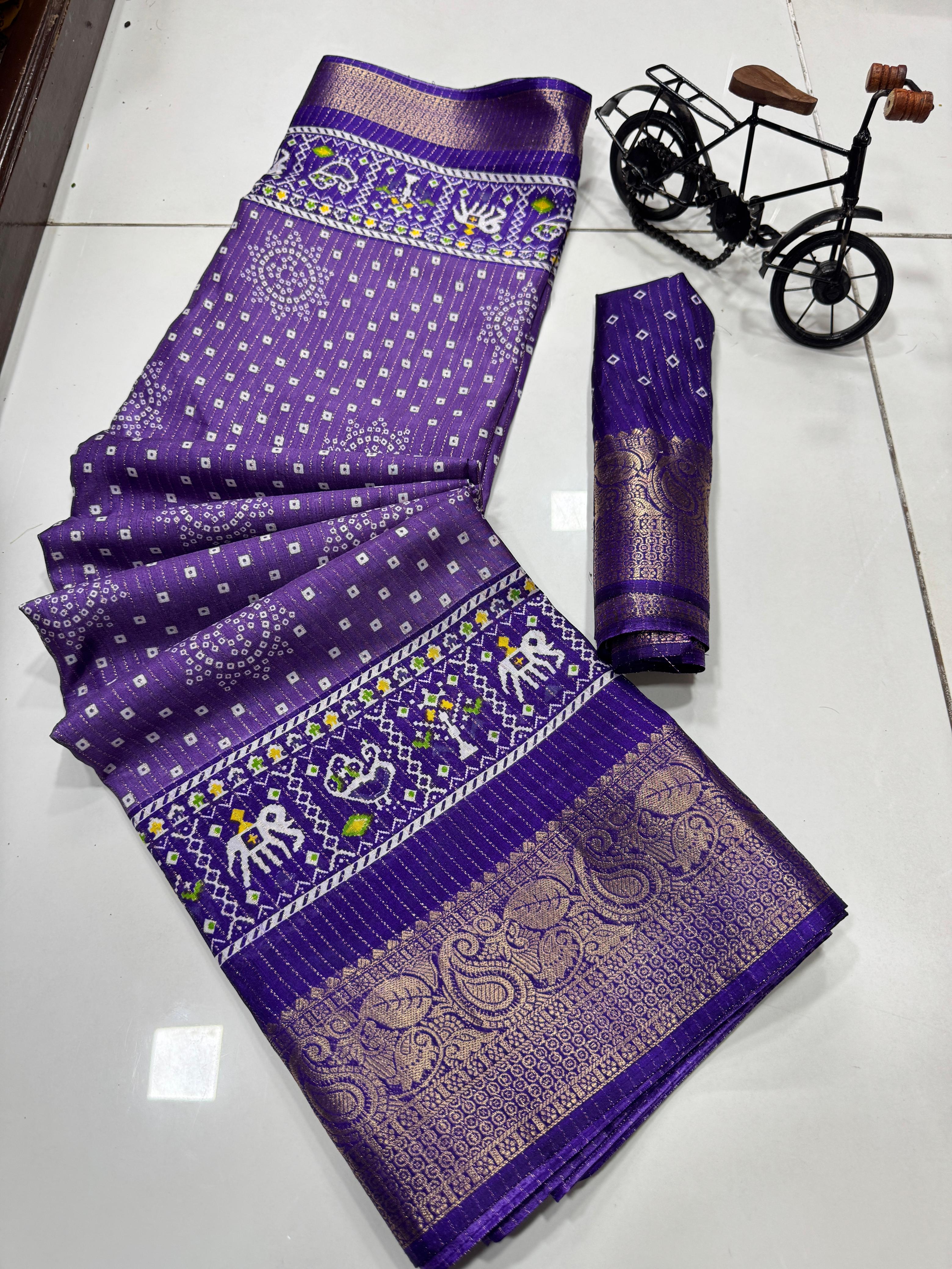 Super pure dola silk Sparkle zari printed fancy Collections of Sarees with Contrast jacquard Border , Pallu and Blouse. Premium Quality Assured. Very Soft Fabric and Beautiful Border and Pallu with Contrast Blouse.dola silk is most Demanding in S