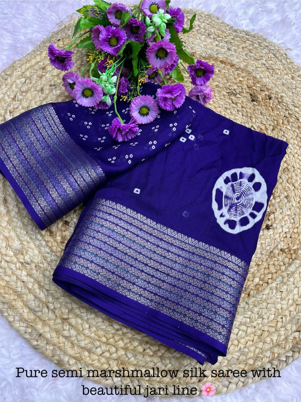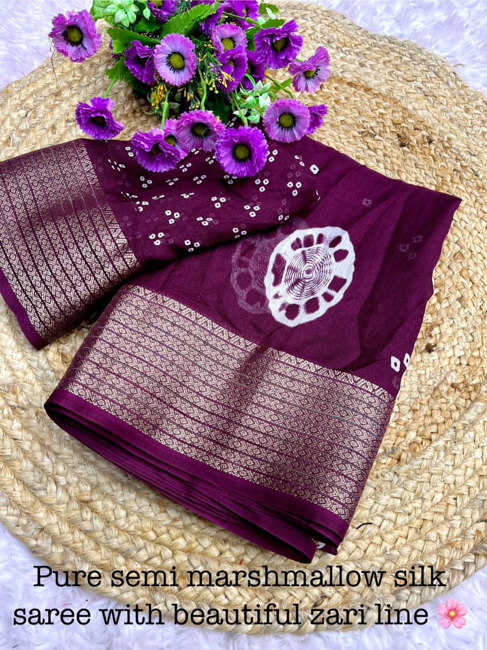 Saree Fabric : Marshmallow Silk || Blouse Fabric : Marshmallow Silk || Saree Work : Bandhni Print|| Blouse Work : Flower Print